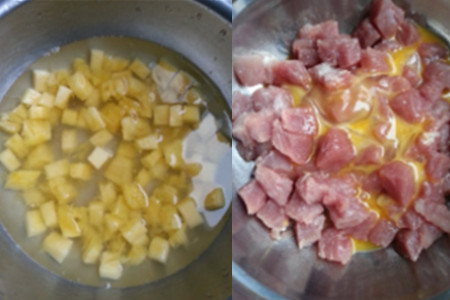 食材:菠萝500克、里脊肉100克、鸡蛋适量、料酒适量、淀粉适量、油适量、盐适量、番茄酱适量。