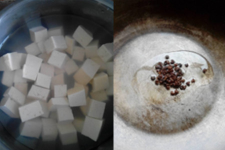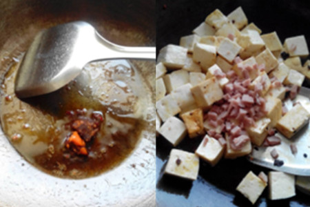 第三步,把油倒入干净的锅中,煮热,接着放入豆腐块,因为豆腐很快煮熟,而且很容易煮烂,所以,煮豆腐的时间不能过长,时间要拿捏好。