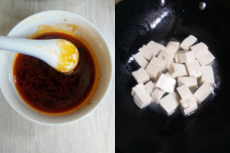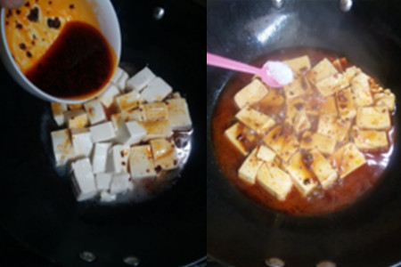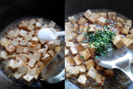 第四步,把刚才调好的酱汁倒入豆腐中,并加入适量的盐,煮开以后在其上撒上适量的葱花。