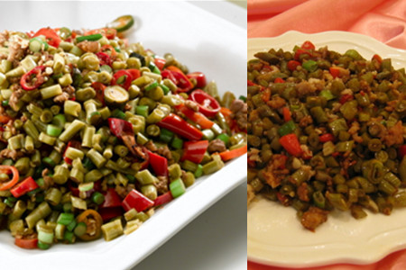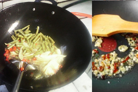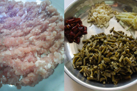 现在介绍第二种家常做法,同样准备以上做法一的食材,做好准备工作后,将炒锅放置在大火上,先将酸豆角下锅炒干水分,在另起锅,锅中放入适量油,烧热后倒入肉碎,加一点点盐调味,再放入酸豆角翻炒,接着依次放入姜、蒜、剁辣椒和酱油,加少量水焖熟,收干汤汁即可出锅。