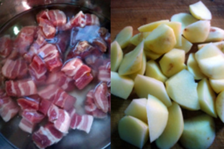 第一步,把买回来的五花肉拿去洗干净,然后将其切成一小块一小块的;用刨刀把土豆皮削去,将土豆切成一块块;把姜刮去皮后切片。
