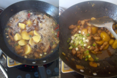 第四步,往锅中倒入一点水,水煮沸后,倒入土豆,盖上锅盖焖煮20分钟,揭盖翻炒几下后加入盐调味,汁收得差不多后撒上剩下的葱花,翻炒均匀,装盘。