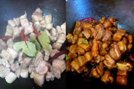 第三步,在锅中放点油,煮热后把浸泡好的五花肉倒入锅中,翻炒到有点黄色,就把草果、八角、姜片以及干辣椒依次放入锅中,接着翻炒。