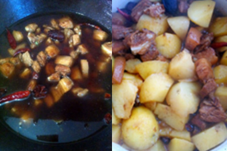 食材:五花肉500克、土豆3个、干辣椒3个、八角3个、姜1块、葱2根、五香粉3克、鸡精3克、老抽6克、盐3克、油15克。