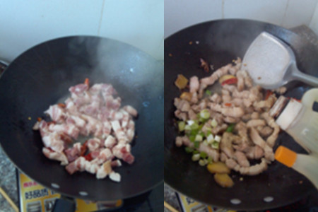 第二步,在锅中倒入油,煮热之后倒入干辣椒以及八角,爆香后加入五花肉,翻炒片刻后加入姜片。