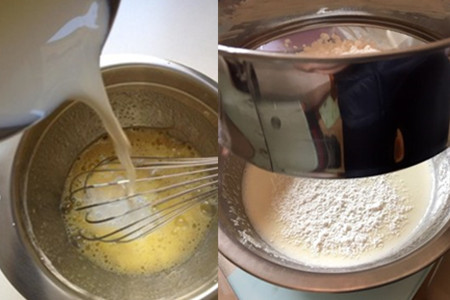 将鸡蛋、糖、盐放在干净容器内充分搅拌均匀,然后将面粉和奶粉混合过筛,分次筛入鸡蛋糊里,边筛边搅拌均匀直到完全没有颗粒。
