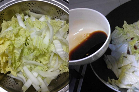 4.然后再倒入适量的油,待烧至5成热的时候,就是油微微冒着小泡的时候就可以将白菜下锅了,将白菜枝干翻炒,让其变得比原来软,之后放入白菜叶子继续翻炒,然后放入刚刚调配好的酱汁,倒酱汁的时候要迅速,在翻炒白菜的过程中也要用大火翻炒,翻炒一会之后,白菜就可以出锅了,一盘醋溜白菜就做好了。