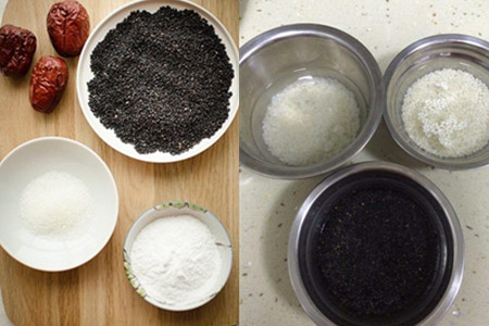 首先,准备好黑芝麻、水、糯米、红枣、冰糖等各种食材。