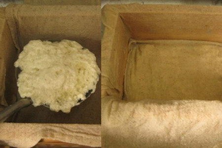 8.将豆花舀入模具,把豆皮布折叠过来铺平,这样以此类推,直到把豆花全部用完。