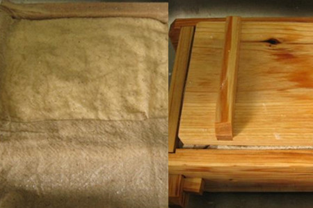 9.将布全部折叠起来放在模具中,用重物压1个小时。1个小时以后,将重物和模具撤掉,就能看到一块块的豆腐皮了。