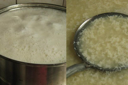 6.把做豆皮的豆皮布浸湿,待豆浆冷却至80度时,将盐卤加入豆浆中,一边加盐卤一边搅动豆浆,直到豆浆中出现絮状物即可,加盖静置20分钟。
