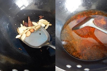3.锅里热油,下葱姜爆香,再放入大料炒香,然后加入豆瓣酱煸炒。