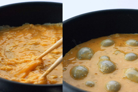 往锅中加入花生油,加热至七八成热为佳。如果你不懂得判断油温,那么当你听到油锅发出吱吱的叫声时就可以放入鸡蛋了。将鸡蛋倒入油锅中,轻轻转动油锅。等一面煎好再翻另一面煎。高温煎鸡蛋能够让鸡蛋更加蓬松柔软,但是要懂得掌控火候。火力太大的话,鸡蛋很容易被煎糊。等鸡蛋煎得差不多的时候,就可以用锅铲切成小块,装到盘子里待用。
