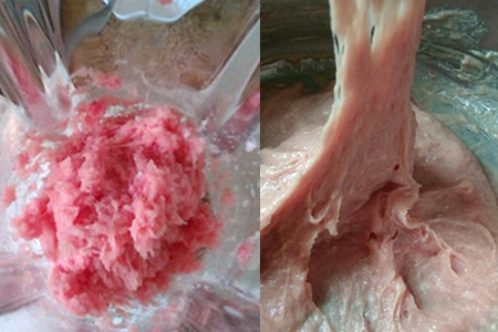 将猪肉洗净切成小块,放入冰箱冷藏十二小时,充分的冷藏可以让肉质出胶,做出的肉丸更有弹性。然后用料理机把猪肉搅打成肉糜状态,如果您对肉丸的品质要求较高,可以用肉锤手工敲打,手工打出的肉泥胶质更足更为粘稠,口感也更好。