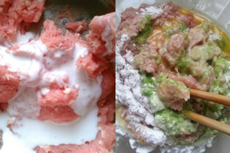将准备好的葱姜汁、鸡蛋液、料酒和淀粉加入肉糜中充分搅拌均匀。注意搅拌时一定要顺一个方向,感觉搅拌阻力很大时表明肉糜已经充分上劲儿了,做出的肉丸也就更Q弹。