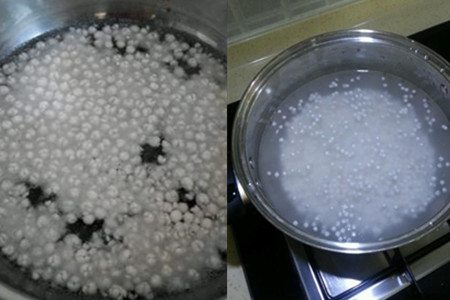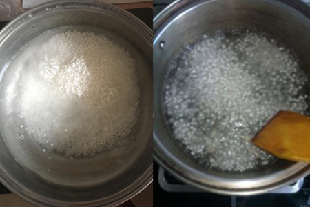 step1、往锅中倒入适量的水和西米,进行熬煮,时间掌握在二十分钟上下,直至水被完全煮开,锅内只剩下一个小白点。