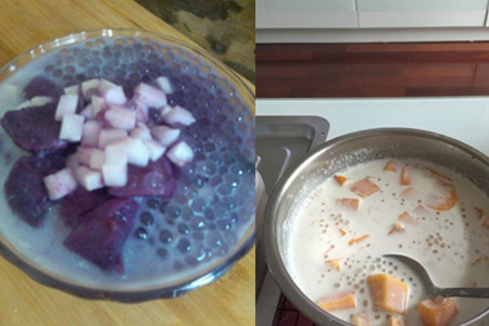 step11、待牛奶被煮开后,倒入处理好的西米,进行搅拌直至所有食材变得均匀,即可享用。
