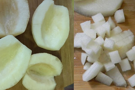 step1、处理一下鸭梨,先将其放入清水中洗净、然后借助水果刀切碎。