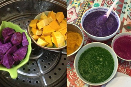 这里选择的是南瓜、菠菜、紫薯,为了丰富色彩尽量不要让蔬果的颜色重复。首先要蒸熟根茎类蔬菜,然后分别放进料理机打泥、榨汁,如果您选择菠菜或者紫甘蓝,需要适量添加水份,并将打泥后的渣滓滤出。