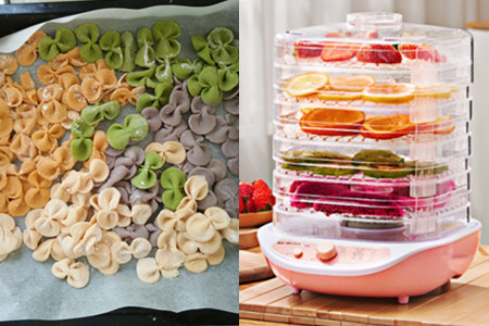 市面上销售的家用食品脱水设备可以帮您小批量烘制面条、果干等食品。将蝴蝶面放在一层一层屉架上,下方的机器有加热、循环出风功能,可以快速将蝴蝶面水分烘干。