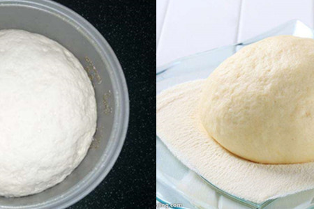 将准备好的牛奶、白糖倒入大碗中去,再加入酵母、面粉,搅拌均匀至无干粉。可以适当用手腕揉面团至光滑状态,就加入经过软化的黄油,继续揉面。用手指掰出一小块面团,能拉开成薄膜为宜。此时,就可以将揉好的面团放入大碗中,盖上保鲜膜密封,让面团充分发酵。用肉眼观察到面团膨胀至原来的2倍大时就代表发酵完成了。