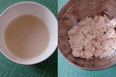 1.酵母装入小碗中,加125克温水,搅拌融化。将酵母水和面粉混合在一起,用工具搅拌成絮状,在用双手揉成团。
