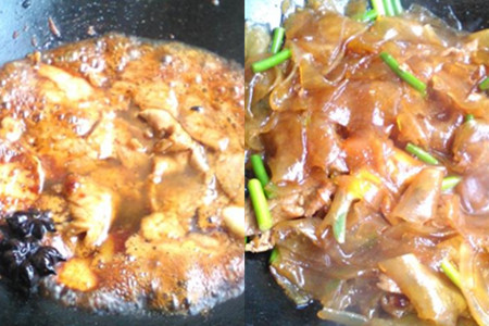 5.将粉皮块加入锅中,兑入50克开水,拌匀,加盖,改成中火焖煮3分钟左右。煮到粉皮透明,锅里汤汁还剩少许时即可装碗。