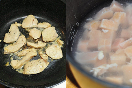 step2、对鸡胸肉进行处理,先放入水中冲洗干净。然后,再投到盛有沸水的锅里面,进行烹煮,此步骤大约花费十五分钟。