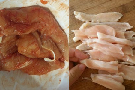 step1、 取出鸡胸肉,对其进行处理,首先用清水冲洗,直至干净为止,然后借助工具刮去表层的脂肪以及筋膜。注意,如果鸡胸肉太厚,可以采用横刀切的方法,将其剖成两小块。