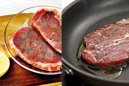 拿出干净的不粘锅,往其中加入少量的橄榄油加油至冒烟,然后就可以放入牛排煎了。煎牛排的时间一定要掌握好,如果牛排大概是1厘米的厚度,那么一面煎1-2分钟就可以翻面了。煎肉的时间不要超过4分钟,否则牛肉就会很老,吃起来非常不好吃。很多人都不会喜欢全熟的牛排,所以可以选择五成熟、八成熟,只要牛肉中没有血水流出就可以放心吃了。