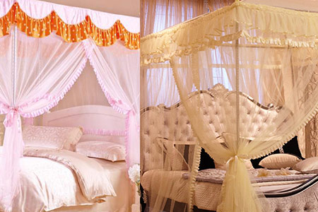 3、将挂钩与宫廷式的装饰物插在四个立柱的顶部,然后用蚊帐上的一些布条系在横柱上,这样能保证蚊帐四面都非常稳固,不会因为拉扯而导致蚊帐错位。
