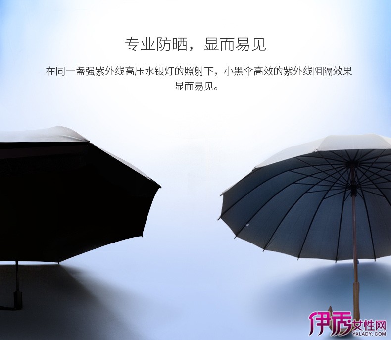 当气温越来越高,紫外线越来越强烈,才发现夏天突然就到了。这样的高温和强紫外线下,若是没有一把有效防晒的伞,走在路上就像在经历炙烤。可是说到选购防晒伞,怎样的一把伞才是好的防晒伞呢?各种专业词汇说多乏味,但是有几个简单的小方法是大家购买时可以用来考量的。首先黑色肯定是防晒性能最好,其次可以看看防晒伞布织物的密度,找一盏光线较强的台灯,关掉室内其他光源,将伞顶贴近台灯,看看隔着伞布能看到多少亮光,织物密度越扎实,光线的穿透率越低,紫外线也是同理。把握好这2点基本就能选出有效的防晒伞了。