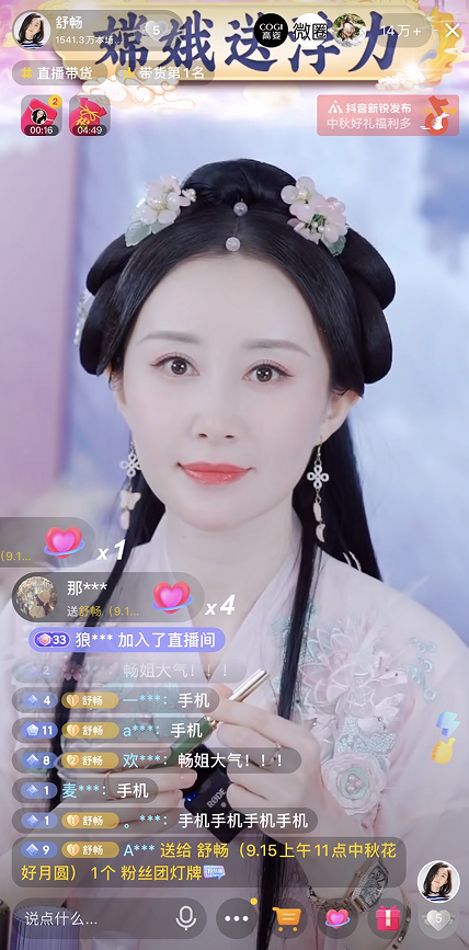 9月15日,从中午11点开始,舒畅以一身温婉典雅的嫦娥造型出现在直播间,。这场直播持续了四个多小时。直播间在线人数一度高达17万,冲上了直播带货榜单第一名,超越带货一姐张庭和带货达人朱梓骁等一众明星带货大佬。