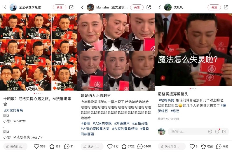 《大家的春晚》直播间也为用户提供了大量二创素材,尼格买提在直播间复盘刘谦魔术的片段就受到很多用户的关注,“捅娄子的打工人狠狠共情了”,“尼格买提演我考完试对答案”等话题点引起了小红书用户的共鸣,并二创了一系列尼格买提表情包。