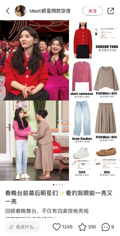 除了内容的二创,小红书上还有很多用户分享出现演员的“春晚同款攻略”,比如章若楠的粉色毛衣、春晚主持人的口红色号、王冰冰在《大家的春晚》直播间的同款套装......